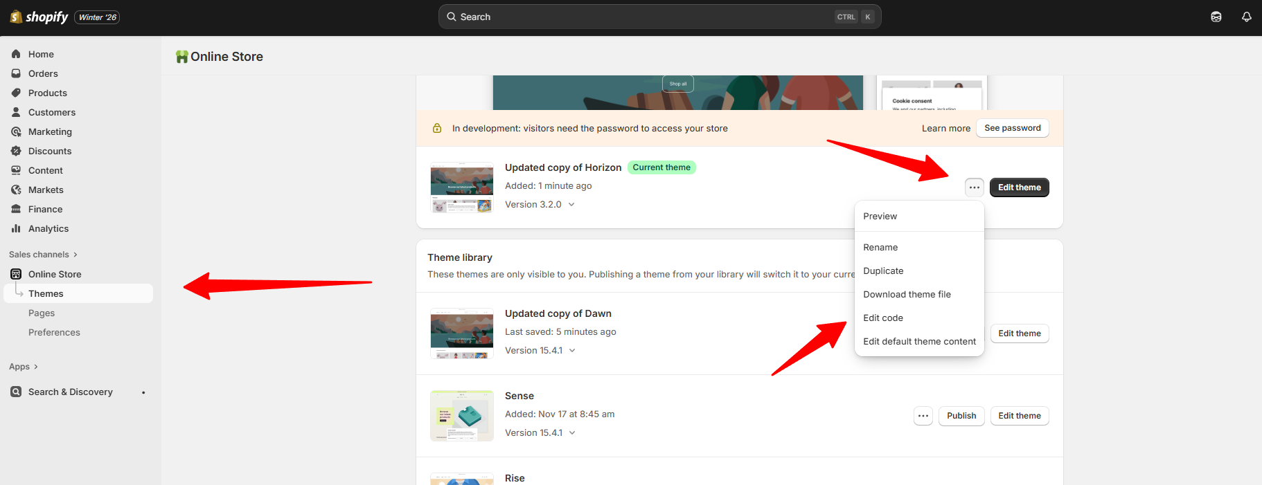 1. Navigate to Online Store > Themes, then click the three dots menu > Edit code