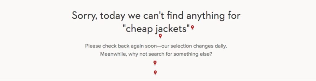 The brand outrightly takes responsibility and does not let you land at “no results” page. It always leaves you with some choice, by simply showing ~200 products, usually the simplest ones just to show you the overall idea of what can you find in store.
